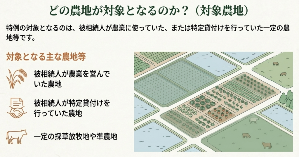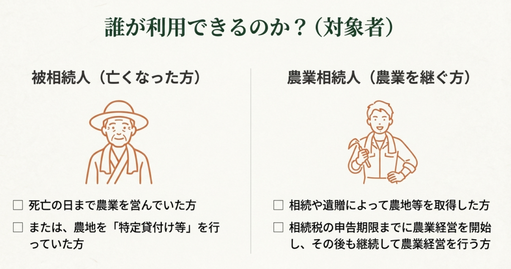 ポイントは、「被相続人(亡くなった方)」と「相続人(引き継ぐ方)」の両方が農業に関わっている必要があるという点です。親子間での円滑な事業承継を想定した制度であることが、この基本構造から読み取れます。