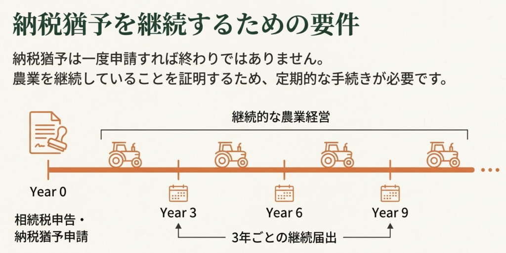 相続人は、取得した農地等において農業を営むか、または特定貸付け等を行う必要があります。これらの行為を継続している場合に限り、納税猶予が適用されます。