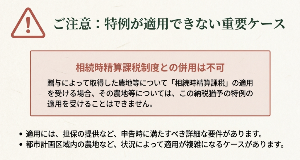 繰り返しになりますが、これは実務上の最重要チェックポイントです。クライアントとの面談では、相続財産の話だけでなく、「被相続人から生前に農地の贈与を受けていませんでしたか?」「その際、相続時精算課税という制度を使っていませんか?」という質問を必ず投げかけてください。この確認を怠ると、適用できると誤解したまま手続きを進めてしまい、後で大きな問題に発展しかねません。