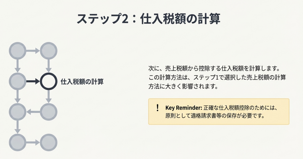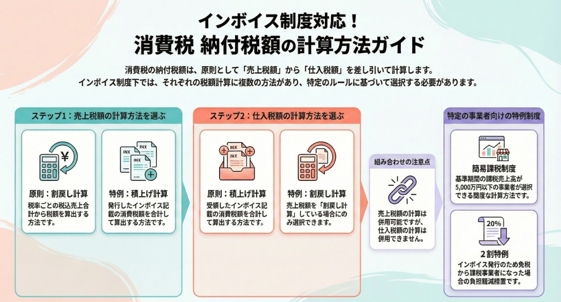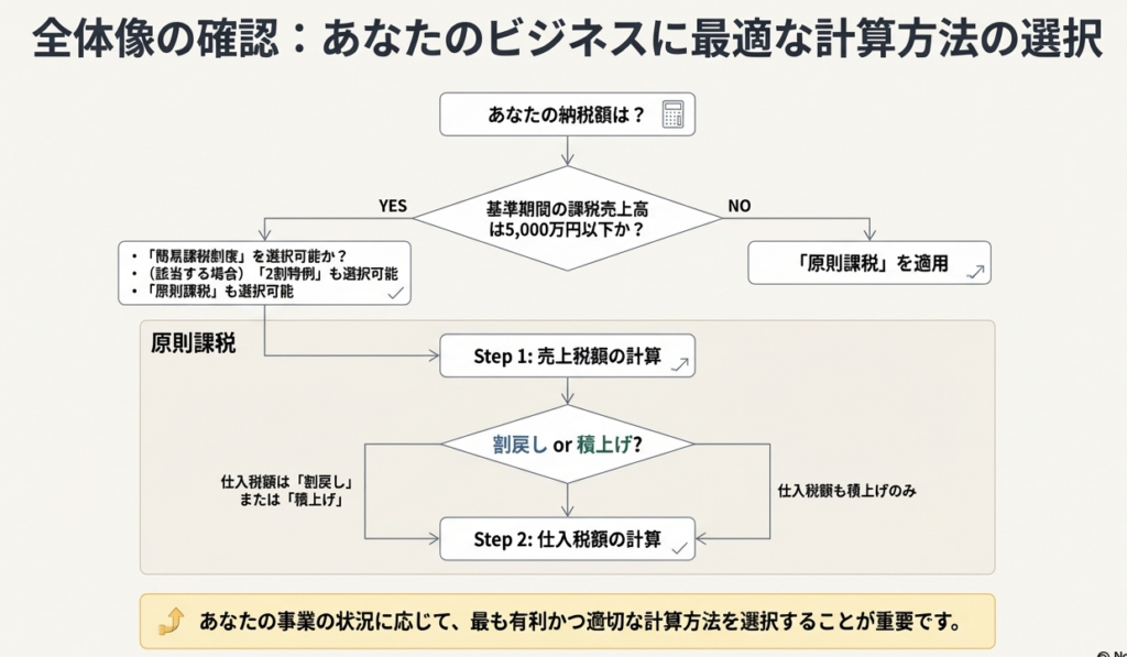 実務上の最重要ポイントは、この式の「売上税額」と「仕入税額」のそれぞれに、複数の計算方法(原則と特例)が存在するという点です。事業者は、自社の取引実態や事務処理能力に応じて、どの計算方法の組み合わせを選択するかが、最終的な納税額に影響を与えることになります。