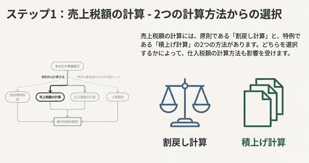 ここからは、消費税の「売上税額」と「仕入税額」を算出するための具体的な計算ルールを掘り下げていきます。それぞれの計算方法が持つ特性と適用条件を正確に理解することが、法令に準拠し、かつ自社にとって最適な税額計算を行うための鍵となります。