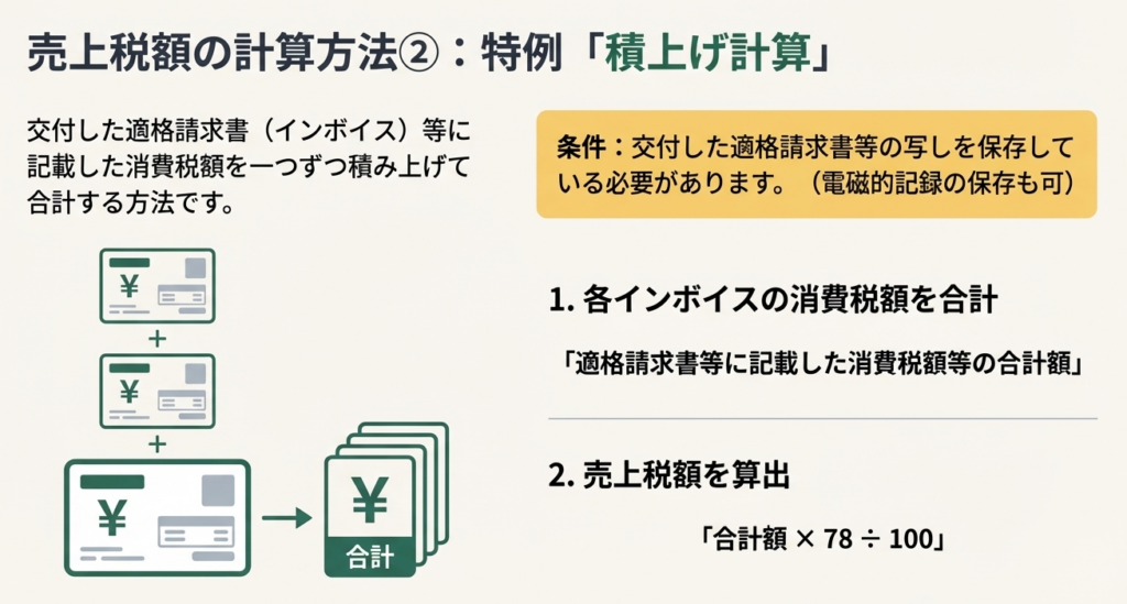 この方法は、取引ごとに発行した適格請求書(インボイス)に記載した消費税額を積み上げて合計する、より直接的なアプローチです。この特例を適用するためには、交付した適格請求書等の写しを保存していることが絶対条件となります。具体的な計算式は、「適格請求書等に記載した消費税額等の合計額 × 78/100」となり、日々の取引で計上した消費税額を基にするため、実務的に管理しやすいという利点があります。