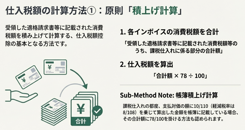 インボイス制度における仕入税額計算の基本となる方法です。取引先から受け取った適格請求書等に記載されている消費税額を一つひとつ積み上げて合計します。計算式は、「適格請求書などに記載されている消費税額等のうち課税仕入れに係る部分の金額の合計額 × 78/100」となります。インボイスに記載された税額を正とする、制度の趣旨に沿った計算方法です。