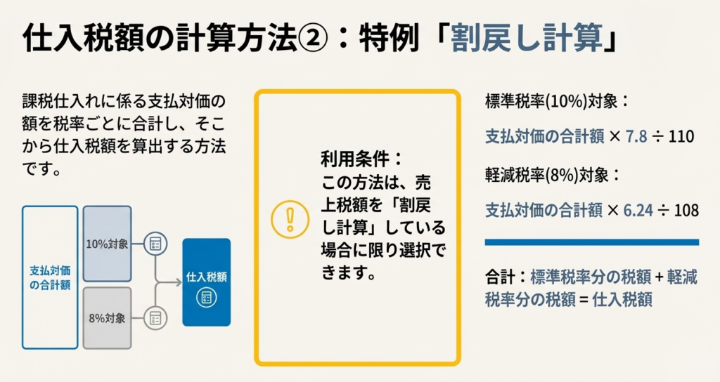こちらは、課税仕入れに係る支払額の合計から税額を算出する方法です。税率ごとに区分した税込支払額の合計に、7.8/110(標準税率の場合)または6.24/108(軽減税率の場合)を乗じて仕入税額を求めます。ただし、この方法を選択するには極めて重要な制約があります。それは、「売上税額を割戻し計算している場合に限られる」という点です。売上税額を積上げ計算している場合には、この方法は選択できません。