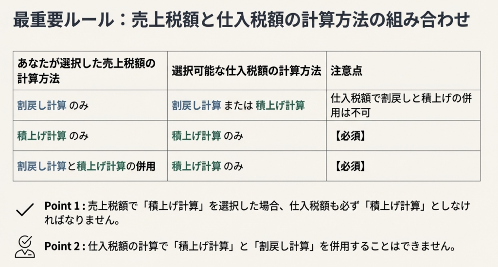 なぜこのような制約があるのか。それは税計算の公平性と一貫性を保つためです。例えば、取引ごとの正確な税額を足し上げる「積上げ計算」を売上で採用しながら、期間全体の総額から概算的に税額を出す「割戻し計算」を仕入で採用することを認めると、計算方法の選択によって納税額が不当に操作される余地が生まれます。