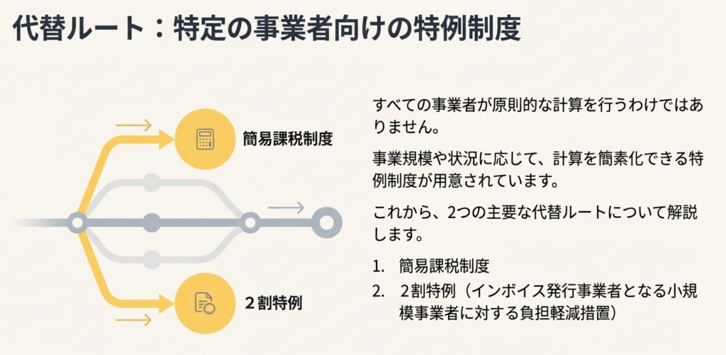 これまで解説した原則的な計算方法(一般課税)は、すべての事業者にとって事務負担が大きい場合があります。そのため、特定の事業者向けに計算プロセスを簡略化する特例制度が設けられています。