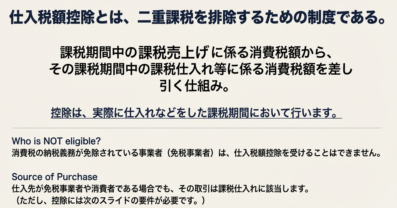 仕入税額控除を適用する際には、いくつかの基本的なルールがあります。まず最も重要なのはタイミングの原則で、控除は「実際に仕入れなどをした課税期間において行う」必要があります。