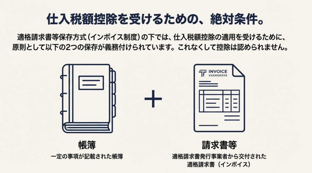 仕入税額控除の適用を受けるためには、大原則として、適格請求書等保存方式(インボイス制度)に基づき、定められた事項が記載された帳簿および請求書等(適格請求書等)を保存する必要があります。この要件を満たさない場合、たとえ課税仕入れに該当する取引であっても控除が認められないため、書類の管理は徹底しなければなりません。