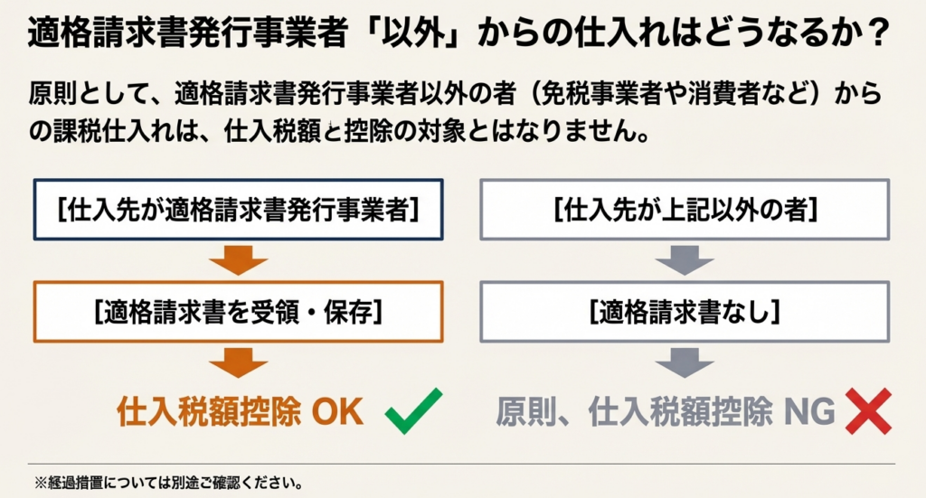 第一に、仕入先が免税事業者や一般の消費者であったとしても、その取引内容は課税仕入れに該当するということです。