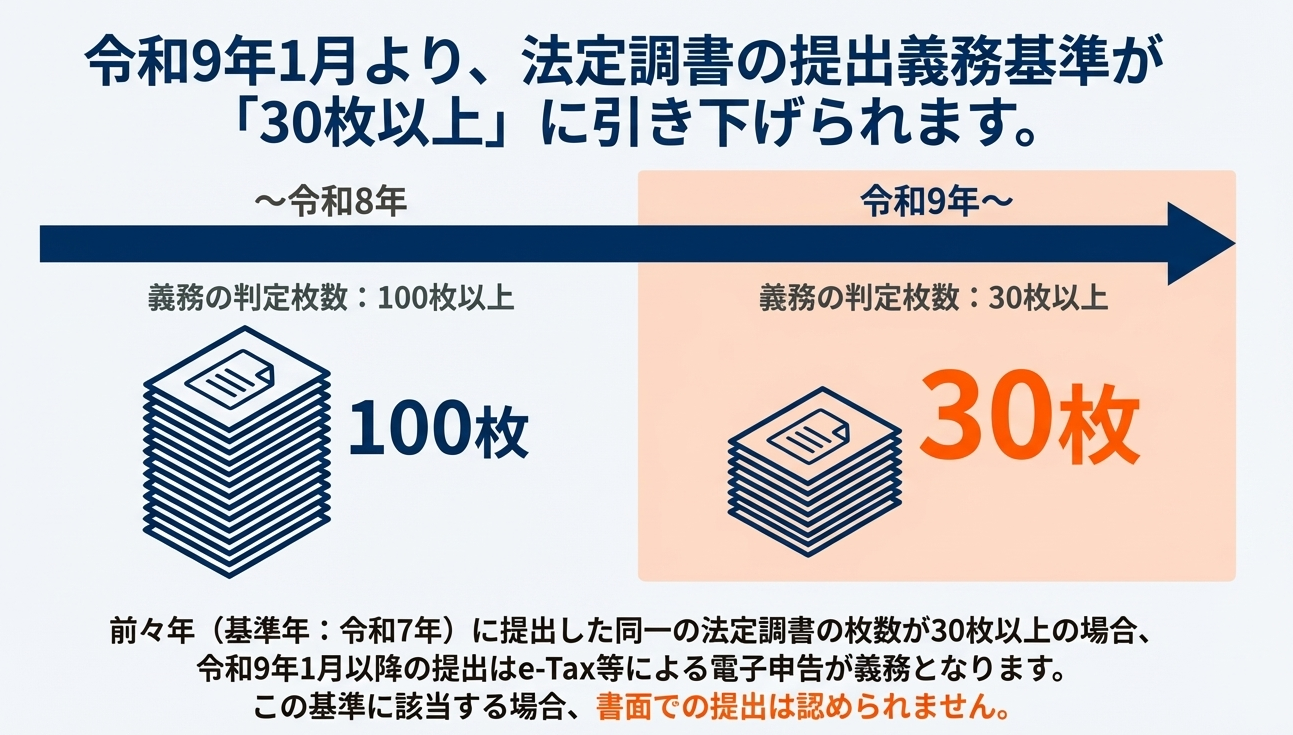 これが、令和9年1月以後に提出する法定調書(令和8年分)から、基準が「30枚以上」へと大幅に引き下げられます。