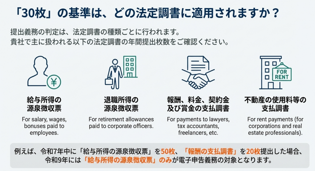 ここで最も重要な注意点は、この枚数判定は法定調書の種類ごとに行うという点です。例えば、令和7年中に提出した「給与所得の源泉徴収票」が35枚で、「報酬、料金、契約金及び賞金の支払調書」が20枚だった場合、「給与所得の源泉徴収票」が30枚以上であるため、令和9年の提出時には少なくとも「給与所得の源泉徴収票」については電子申告が義務となります。