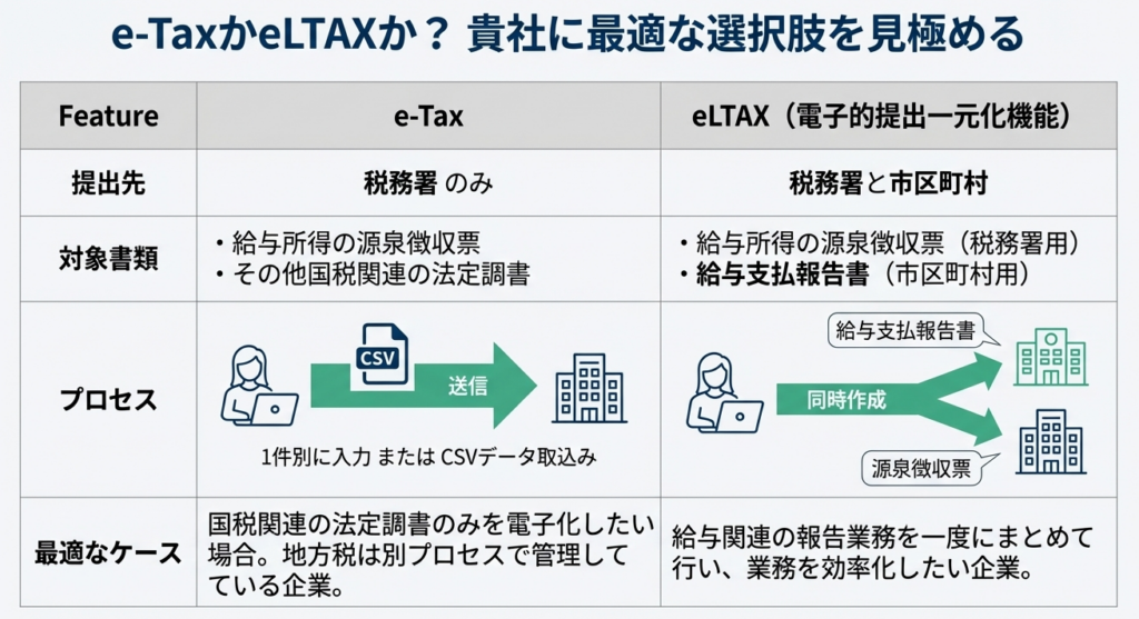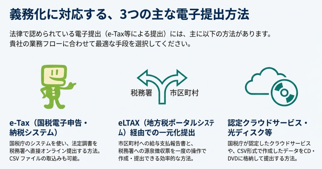 前述の通り、eLTAXの「電子的提出一元化機能」を利用すれば、地方税(給与支払報告書)と国税(源泉徴収票)の手続きを一度に行えるため、特に給与支払報告書の提出義務がある事業者にとっては最も効率的な方法と言えるでしょう。