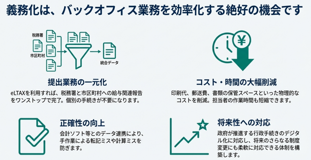 手続きの一元化: 地方税ポータルシステム(eLTAX)の「電子的提出一元化機能」を利用することで、税務署へ提出する「給与所得の源泉徴収票」と、各市区町村へ提出する「給与支払報告書」のデータを同時に作成し、一括で送信することが可能になります。これにより、年末から年始にかけての煩雑な事務作業を大幅に効率化できます。