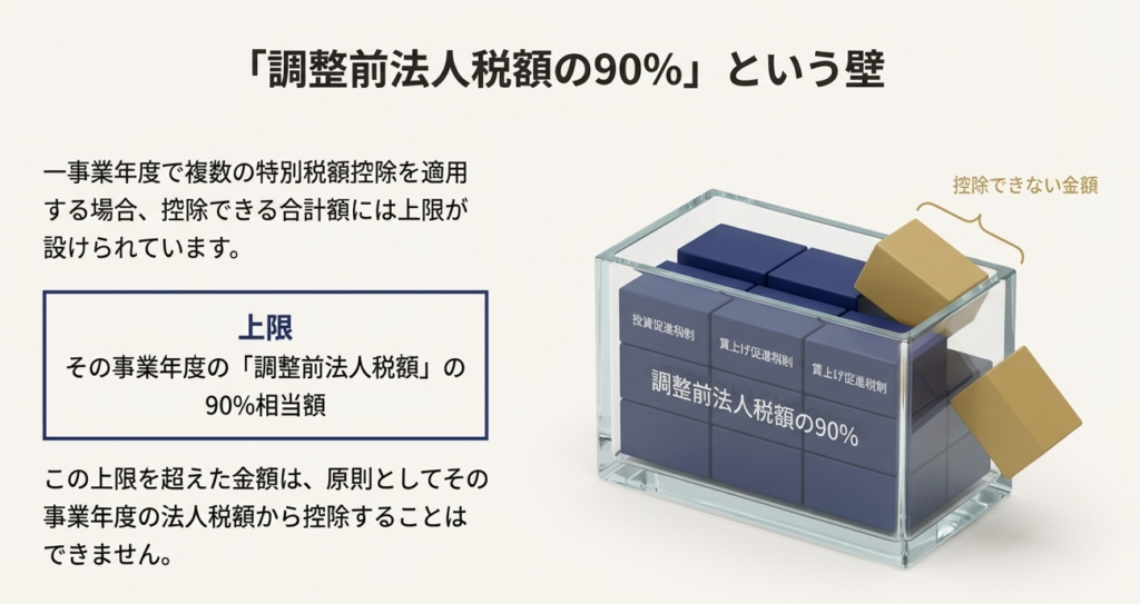 しかし、これらの有益な制度を複数同時に適用しようとする際、実務担当者が直面しがちな「落とし穴」が存在します。それは、控除できる税額の合計には「その事業年度の調整前法人税額の90%」という上限、通称「90%上限ルール」が設けられているという事実です。この上限を超えた金額は、原則としてその事業年度では控除できず、切り捨てられてしまいます。このルールを知らずに税額控除を計画すると、想定していた節税効果が得られないばかりか、本来活用できたはずの控除額を失ってしまうことにもなりかねません。