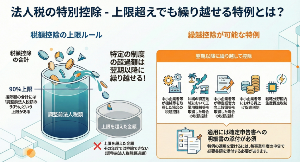 ただし、上限を超えた金額のすべてが切り捨てられるわけではありません。特定の5つの税額控除制度に由来する超過額については、特例として翌期以降に繰り越し、将来の法人税額から控除することが認められています。