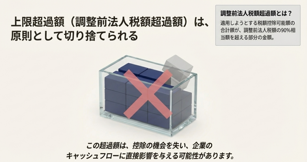 税額控除の上限を超える部分の金額は、「調整前法人税額超過額」といいます。これは、適用を受けようとする税額控除可能額の合計額が、調整前法人税額の90%相当額を超える部分を指します。