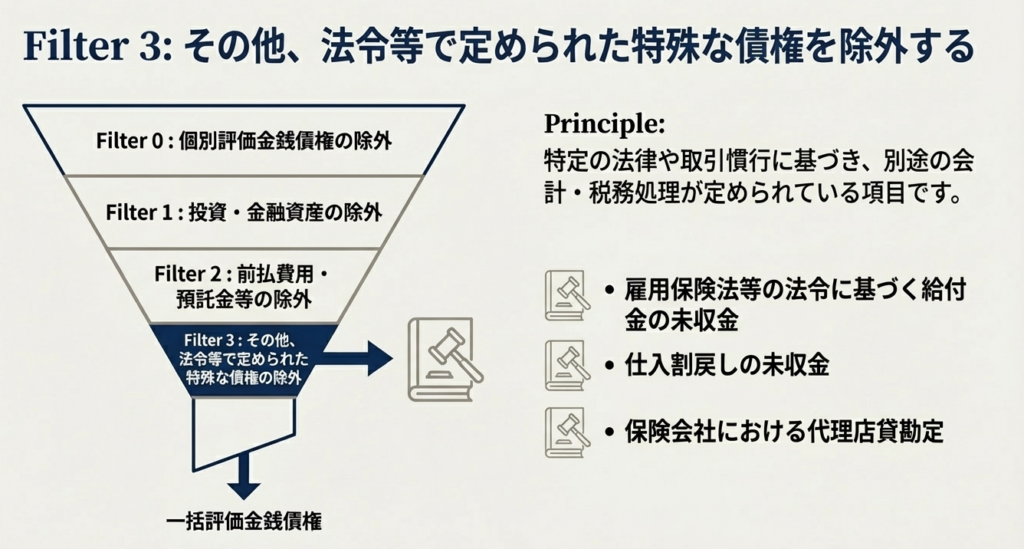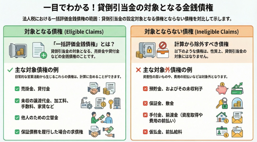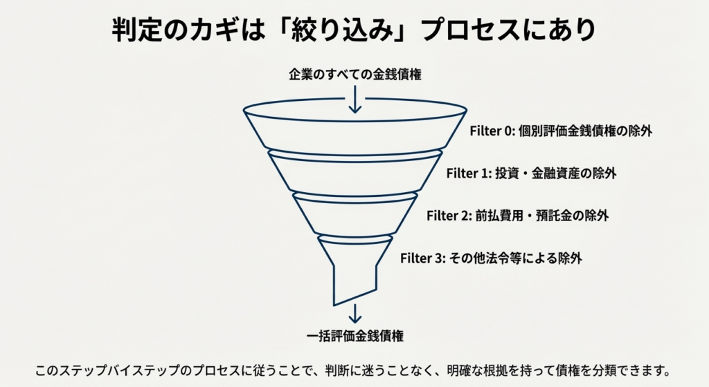 本稿は、企業の経理担当者や我々の事務所の若手スタッフが、この複雑な判定を正確に行えるよう、その判断基準を明確に解説することを目的としています。そこで本稿では、まず結論として対象債権の核心を提示し、その後、具体的な範囲と実務上の判断基準を詳述していきます。
