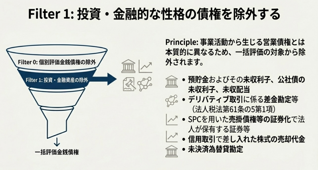 「保証金」や「敷金」は、契約終了時に返還されることを前提とした預け金であり、通常の営業債権とは異なります。また、「手付金」や「前渡金」は、不動産や商品といった資産を取得するための対価の一部であり、将来、資産に振り替わるべき性質のものです。このように、将来返還される予定の預け金や、資産の取得対価となるものは、貸倒れのリスクを評価する金銭債権とは性質が異なるため、対象から除外されます。