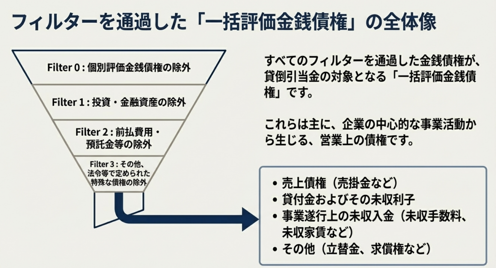 一括評価金銭債権とは、貸倒引当金の計上対象となる金銭債権のうち、個別評価を行うものを除いた売掛金や貸付金、およびこれらに準ずる債権を指します。