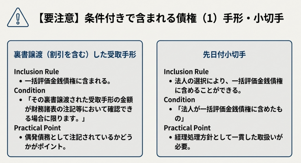 裏書譲渡した受取手形が対象となるためには、その裏書譲渡された受取手形の金額が、財務諸表の注記等において確認できる場合に限られます。この条件を満たすことで、実質的な債権として評価の対象となります。