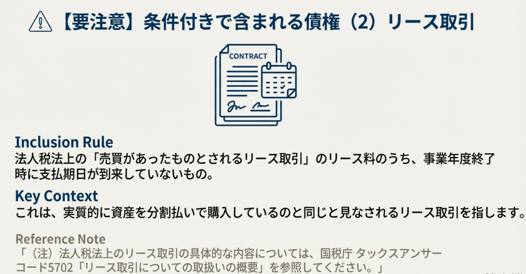 売買があったものとされる法人税法上のリース取引において、事業年度終了の時に支払期日の到来していないリース料が対象となります。これは、将来受け取るべき債権として扱われるためです。