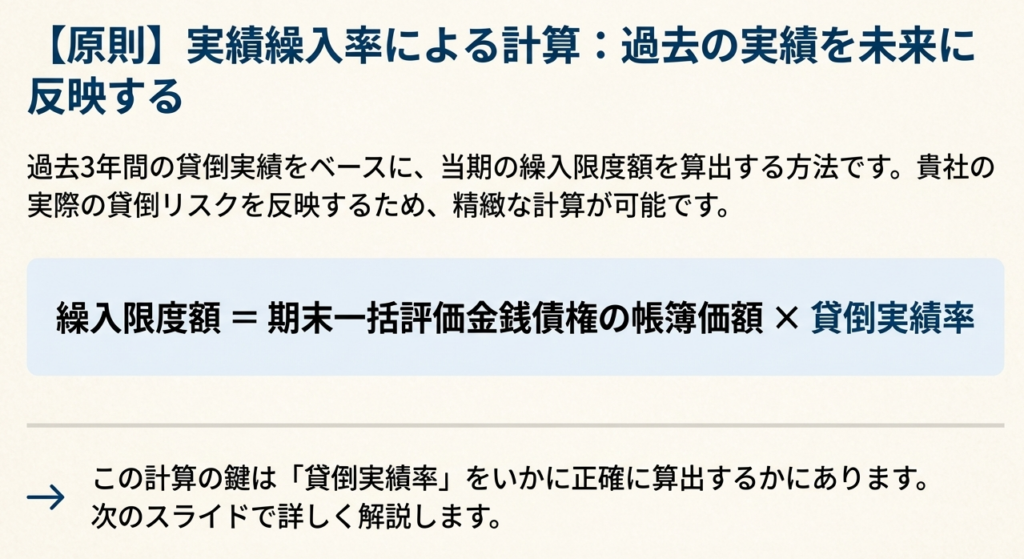 原則的な方法は、事業年度末の一括評価金銭債権の帳簿価額合計額に、過去3年間の貸倒損失発生額に基づく実績繰入率を乗じて繰入限度額を計算します。この実績繰入率は貸倒実績率とも呼ばれます。