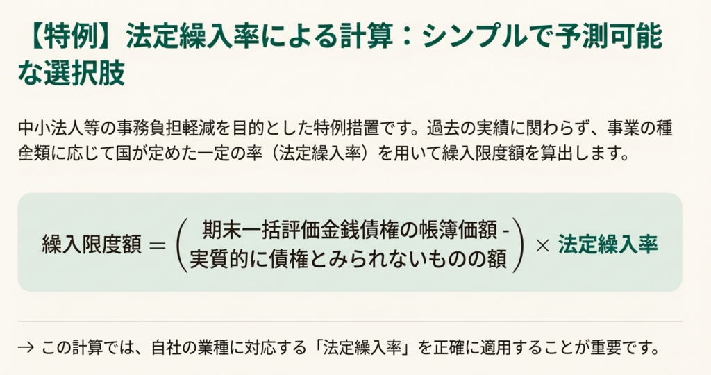 中小法人等向けの特例として、法定繰入率に基づく計算が認められています。これは、過去の貸倒実績に基づく実績繰入率の代わりに、事業の種類ごとに定められた法定の率を用いて繰入限度額を計算する方法です。