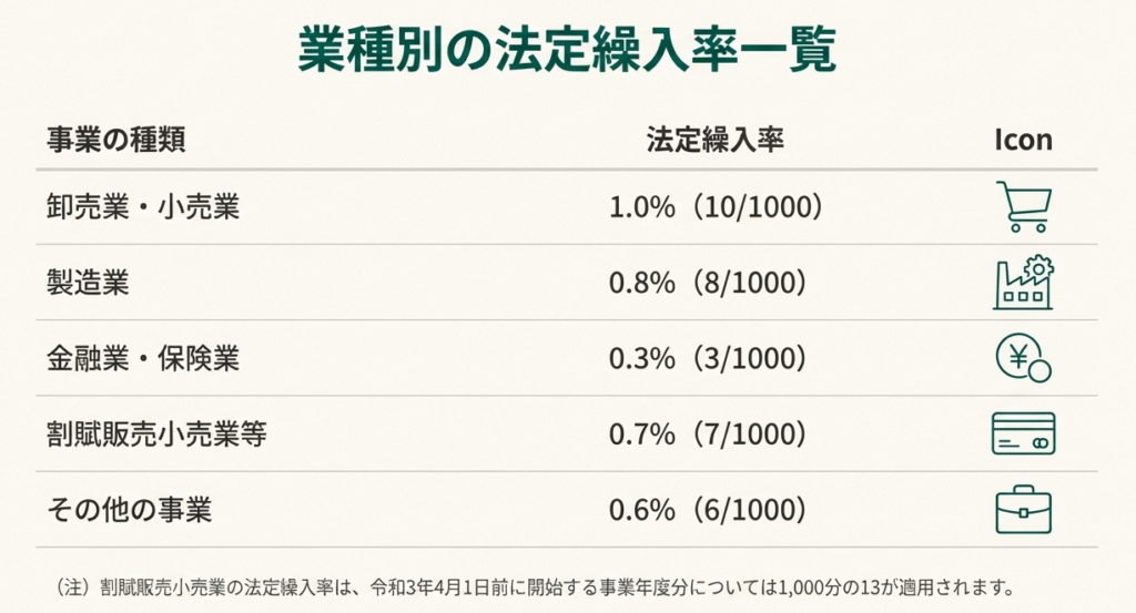法定繰入率は、金融業および保険業では1,000分の3、製造業(電気業、ガス業、熱供給業、水道業および修理業を含む)では1,000分の8が適用されます。
