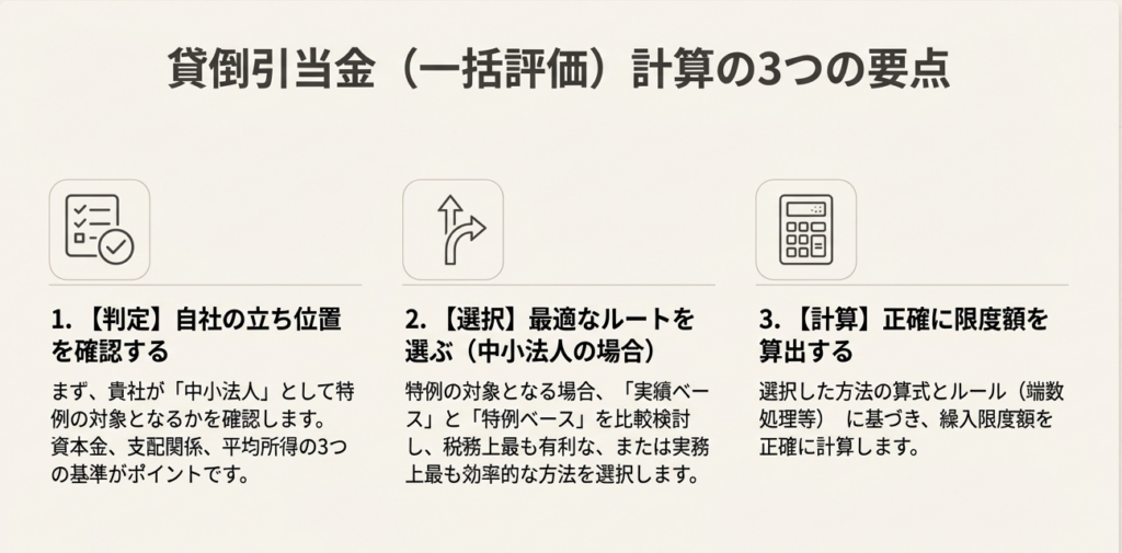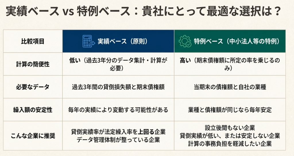 ◦ 第一ステップで「中小法人」に該当した場合、原則的な「実績繰入率」と、特例である「法定繰入率」のいずれか有利な方を選択して適用することができます。実務上は、両方で限度額を計算し、より多くの損金算入が認められる方を選ぶことになります。