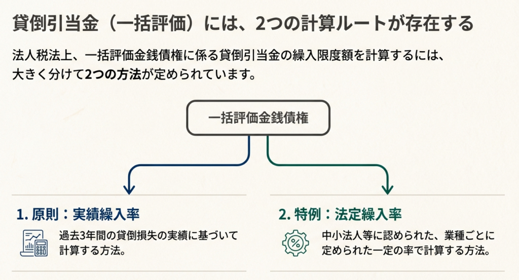 法人税法上、一括評価金銭債権に係る貸倒引当金の繰入限度額を計算するには、大きく分けて2つのルートが存在します。1つは、過去の貸倒実績に基づいて計算する原則的な方法である「実績繰入率」を用いるルート。もう1つは、主に中小法人等の事務負担を軽減するために設けられた特例措置である「法定繰入率」を用いるルートです。