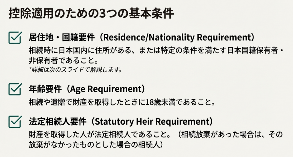 控除を受けるには、(1)財産取得時の住所や国籍に関する特定の要件を満たすこと、(2)財産を取得したときに18歳未満であること、(3)法定相続人であること、という3つの要件をすべて満たす必要があります。