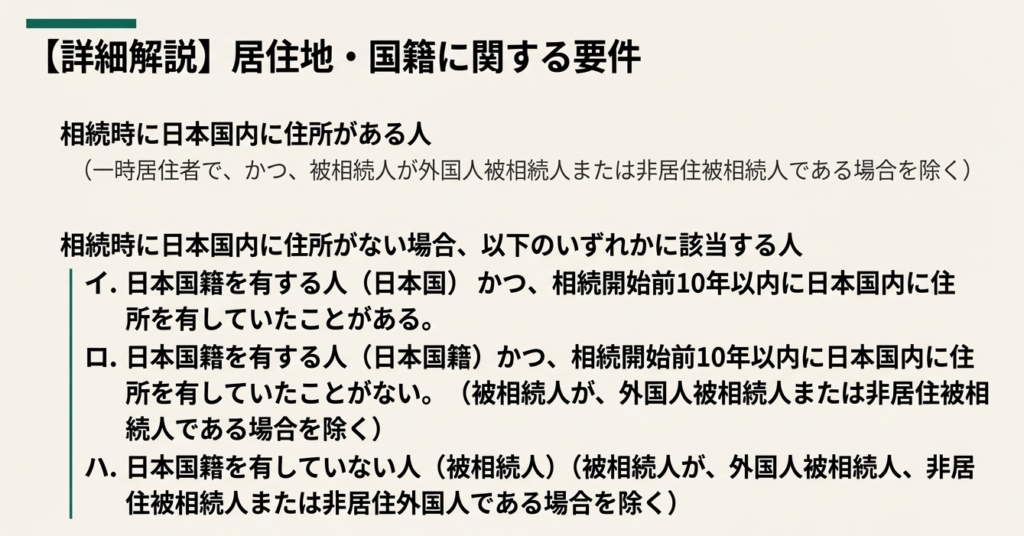 ▪ ロ:日本国籍を有しており、かつ、相続開始前10年以内に日本国内に住所を有していたことがない人(被相続人が、外国人被相続人または非居住被相続人である場合を除きます。)