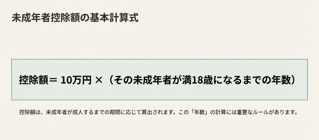 未成年者控除の額は、その未成年者が満18歳になるまでの年数1年につき10万円で計算されます。年数の計算では、1年未満の期間は切り上げて1年とします。
