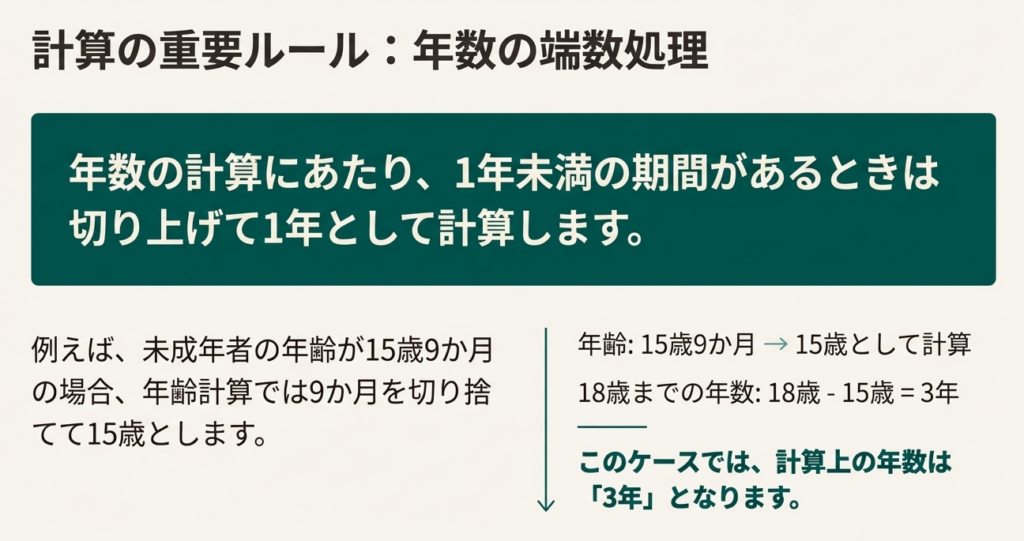1年未満の期間は切り上げて1年として計算します。例えば、相続人の年齢が15歳9か月の場合、満18歳までの年数は3年と計算され、控除額は10万円×3年で30万円となります。