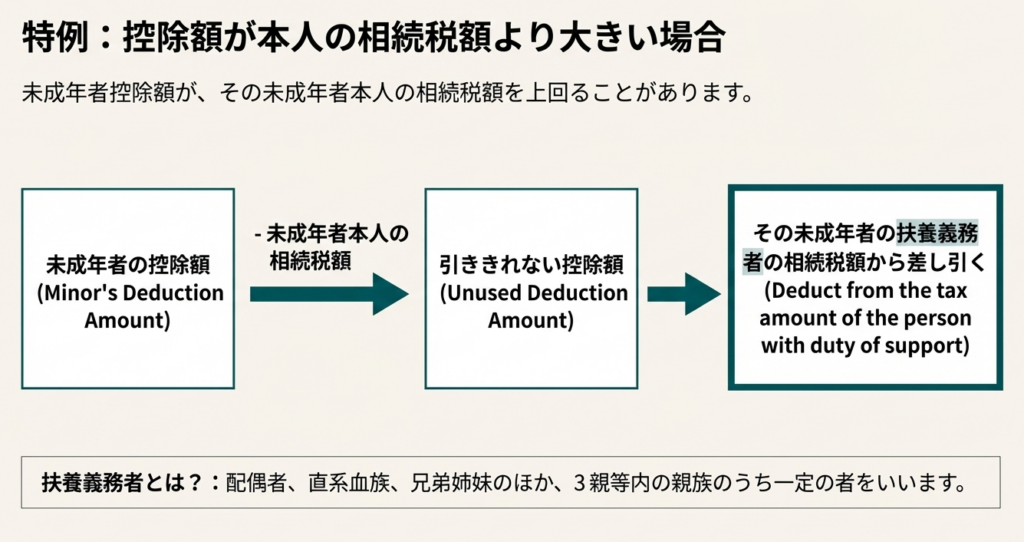 未成年者の相続財産が少ない場合など、算出した控除額が本人の相続税額を上回ることがあります。この場合、控除しきれなかった金額は、その未成年者の「扶養義務者」の相続税額から差し引くことができます。