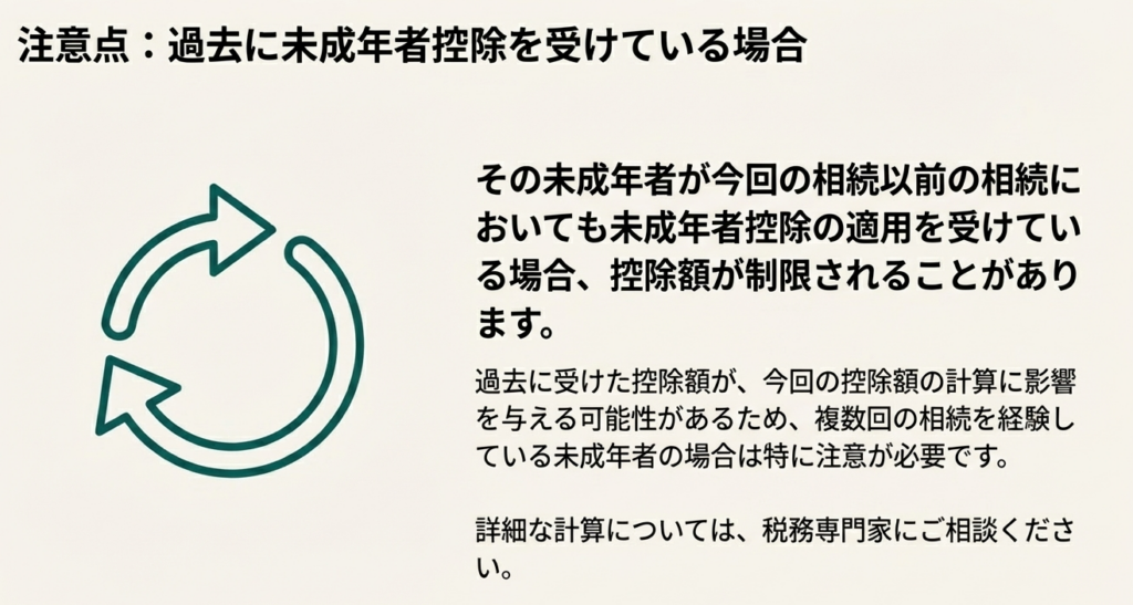国税庁の資料にも「今回の相続以前の相続においても未成年者控除を受けているときは、控除額が制限されることがある」と明記されています。クライアントへのヒアリング項目に「過去に未成年者控除を受けたことがありますか?」という質問を加え、二重控除による制限の可能性を必ず確認してください。