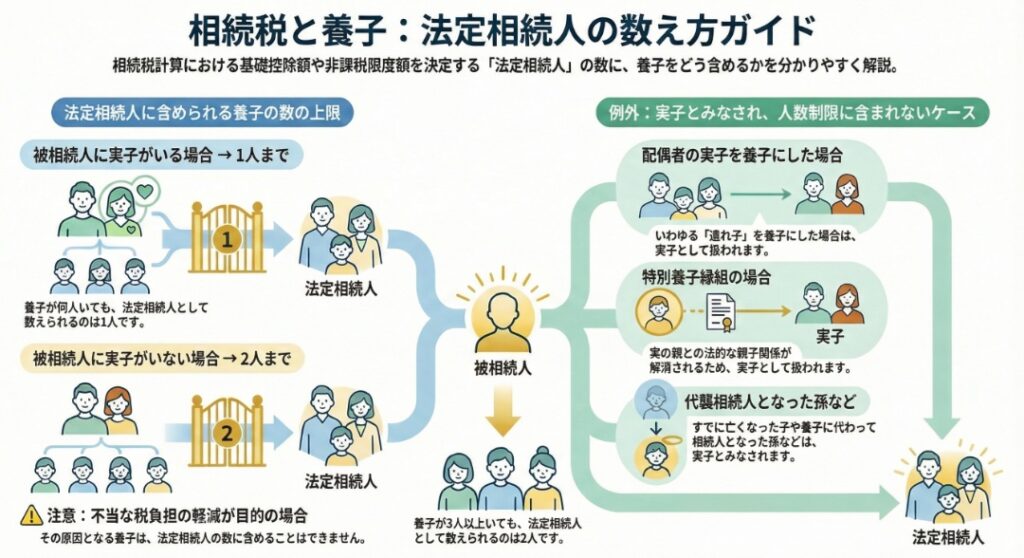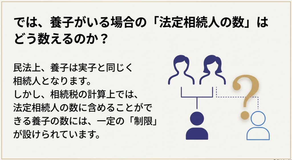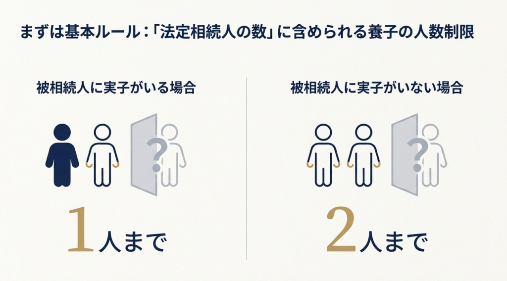 相続税法では、養子縁組を利用した相続税の不当な租税回避を防止する目的で、法定相続人の数に含めることができる養子の数に一定の制限を設けています。この基本ルールは、我々が実務で判断を下す際の核となるものです。