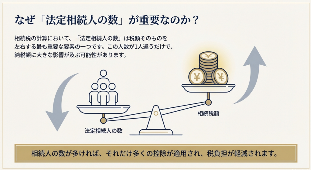 相続税の計算では、法定相続人の数が基礎控除額や生命保険金・死亡退職金の非課税限度額、税額の総額算出に大きく影響します。