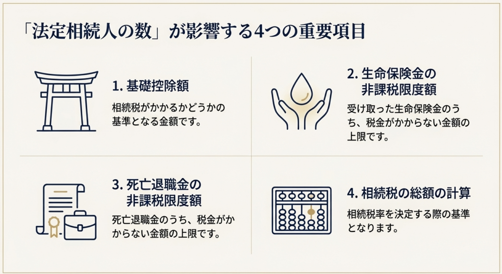相続税の計算で法定相続人の数を基にする4項目は、「相続税の基礎控除額」「生命保険金の非課税限度額」「死亡退職金の非課税限度額」「相続税の総額の計算」です。これらの項目は、相続人の数によって控除額や計算方法が変動します。