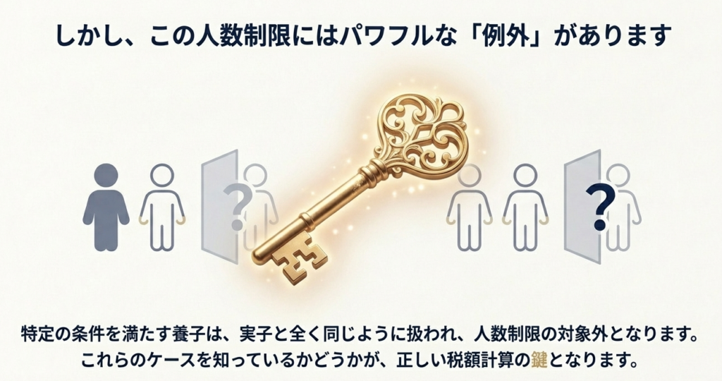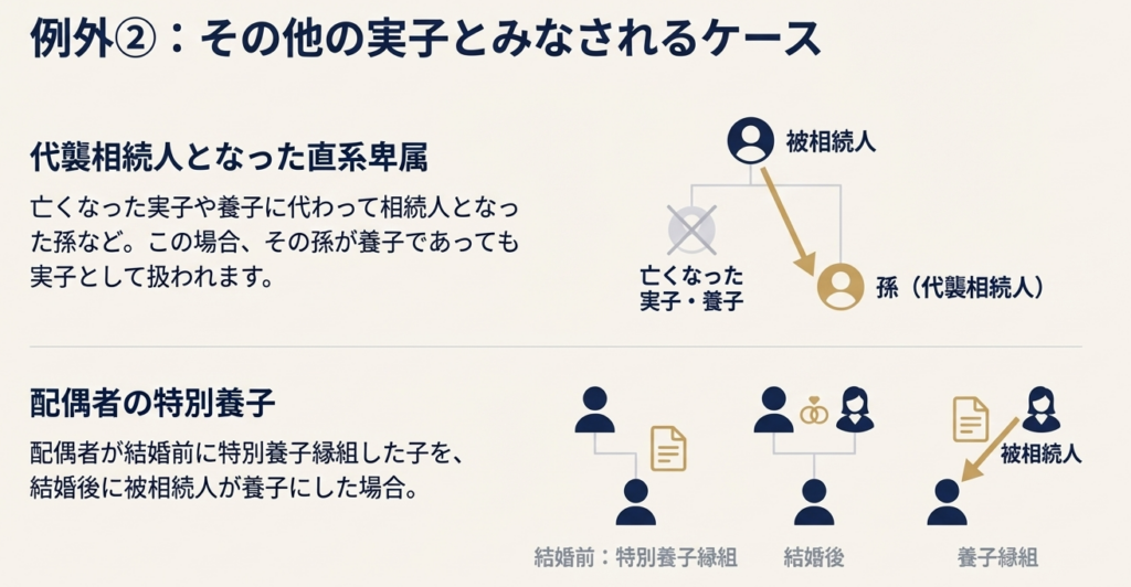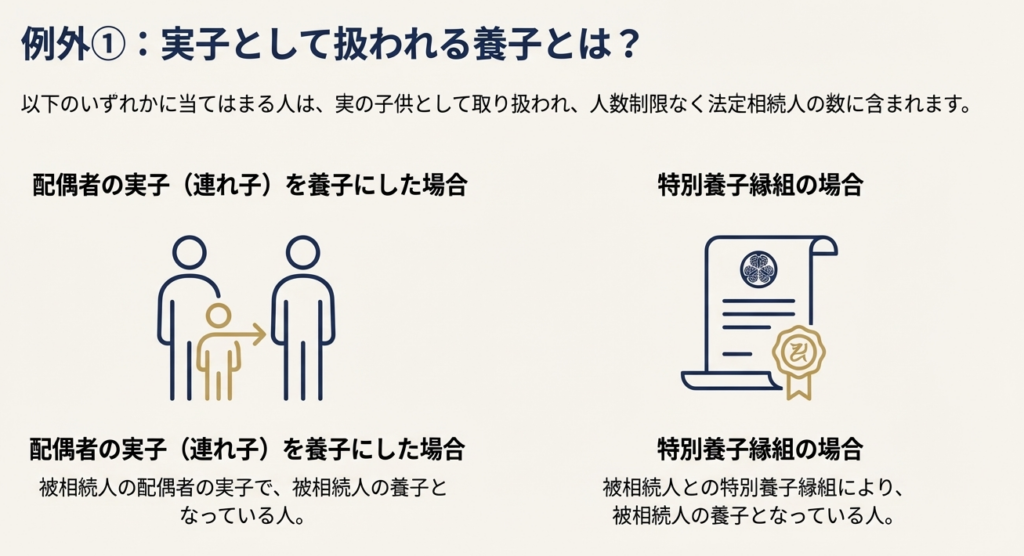 上記の人数制限の原則には、極めて重要な例外が存在します。特定の事情を持つ養子は、税法上「実子」と同様に取り扱われ、人数制限の対象外となります。つまり、これらの養子は常に法定相続人の数に含まれます。