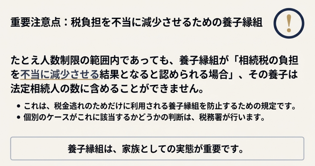ただし、この原則には重要な注意点があります。養子の数を法定相続人の数に含めることで相続税の負担を不当に減少させる結果となると認められる場合、その原因となる養子の数は、上記の人数に含めることはできません。