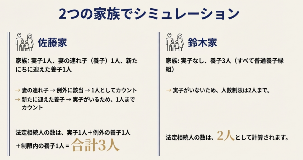 • 被相続人に実の子供がいる場合: 法定相続人の数に含めることができる養子の数は1人までです。