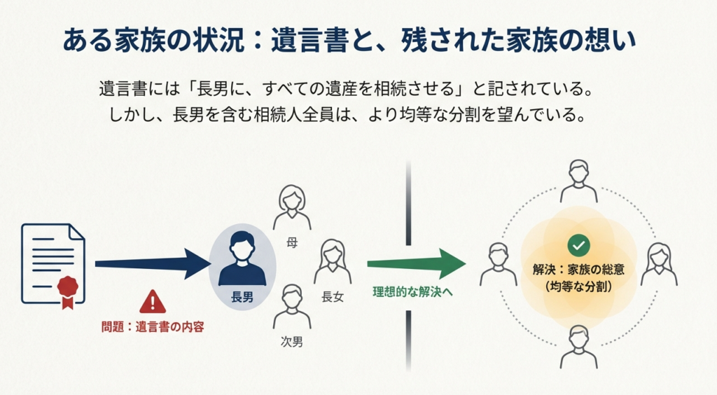 遺言書で特定の相続人に全財産を与える旨の指定があっても、相続人全員の合意があれば、遺言内容とは異なる遺産分割を行うことが可能です。