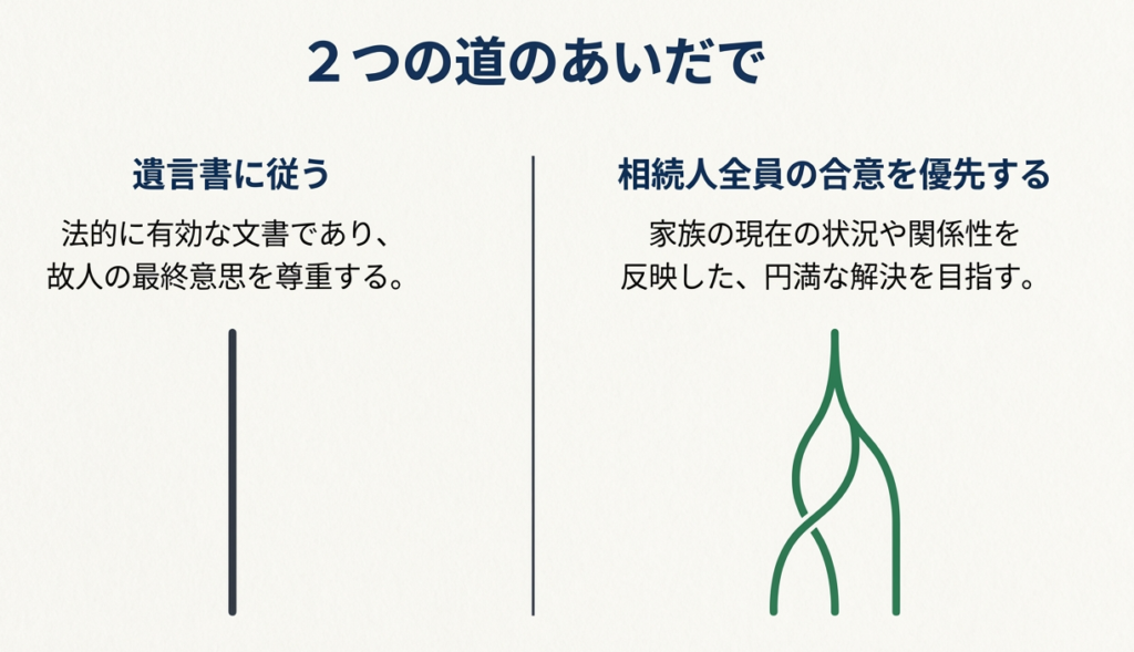 遺言は、被相続人の最終意思として最大限尊重されるべきものです。しかし、相続実務の現場では、残された相続人間の関係性や各々の生活状況の変化などを考慮し、遺言の内容とは異なる形で遺産を分割したいという要望がクライアントから寄せられるケースが少なくありません。このような状況において、我々が的確なアドバイスを提供できるか否かは、クライアントの信頼を勝ち取る好機であると同時に、万一誤れば信頼を根本から揺るがしかねない重大な分岐点となります。