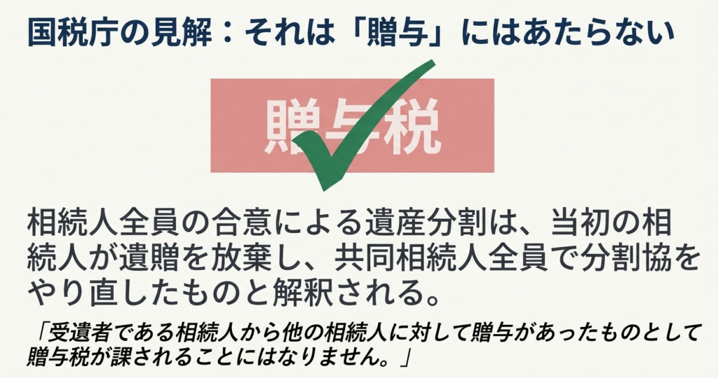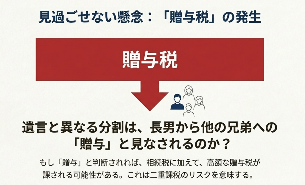 本件の税務上の取扱いが適用される大前提は、遺産分割協議が「共同相続人全員」の合意によって成立していることです。一人でも合意に至らない相続人がいる場合、遺言書が原則として有効となり、この税務上の取扱いは適用できません。その後の相続人間での財産移転は、別途「贈与」と見なされ、思わぬ贈与税が課されるリスクがあることを厳しく指導してください。