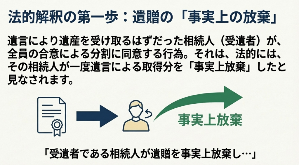 | 事実上放棄 | 法的な放棄手続きを経ずとも、その行動が実質的に権利を放棄したとみなされる状態。この文脈では、受遺者が遺言による取得分を主張せず、分割協議に応じることを指す。 |