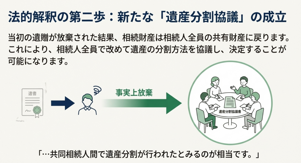 この場合、遺言書で財産を受け取るはずだった受遺者である相続人が、その遺贈を事実上放棄したものとみなされます。その上で、改めて共同相続人全員の間で遺産分割が行われたと解釈するのが相当であるとされています。