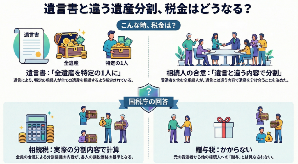 3. 遺言書の内容と異なる遺産分割を相続人全員が行った場合、税務上はどのように解釈されますか?
