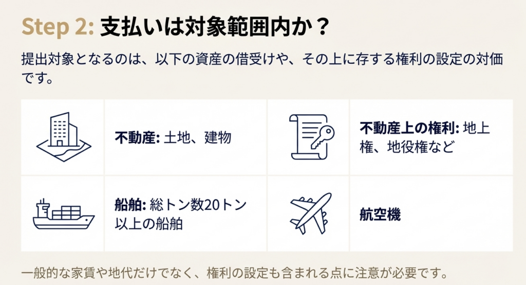 不動産の他に、不動産の上に存する権利、総トン数20トン以上の船舶、そして航空機が対象資産として挙げられています。これらの借受け対価の支払いも提出範囲に含まれます。