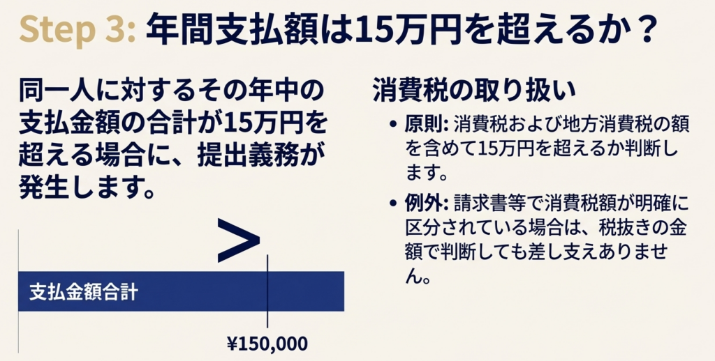 提出が必要となる金額の基準は、**「同一人に対するその年中の支払金額の合計が15万円を超えるもの」**と定められています。